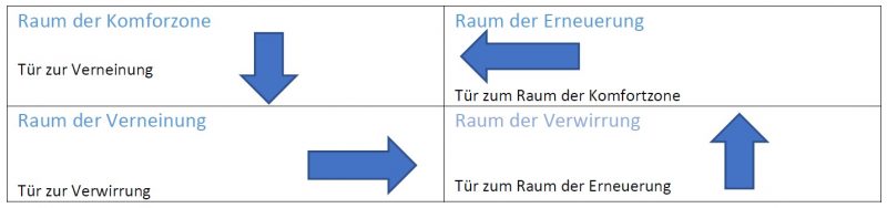 Sollte Dein Coachee jedoch in Verwirrung und Verneinung verharren, kannst Du gut mit Glaubenssätzen arbeiten und beispielsweise folgende Fragen dazu stellen: wann ist es Dir denn schon mal gelungen mit einer ähnlichen Situation umzugehen? Wie bist Du dabei durch die einzelnen Räume geschritten? Welche Ressourcen kannst Du hierzu wieder aktivieren? Zeige auf, wie sinnvoll und wichtig es ist, alle Räume zu durchschreiten.